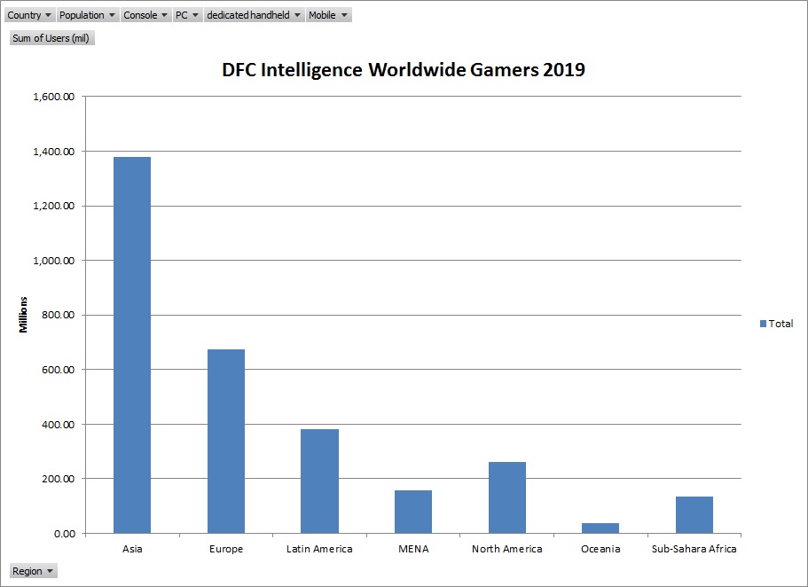 DFC Intelligence recently released its latest global video game consumer segmentation. This report breaks out the number of game consumers by country, region, and platform. With the growth of mobile devices, the number of worldwide video game players has soared past 3 billion. However, without further detail, this is a rather meaningless number.