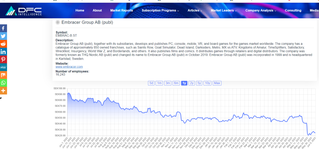 The Embracer Group continued to make some big acquisition moves in 2022. This included buying board game company Asmodee for $3 billion and getting the Eidos/Crystal Dynamic properties from Square Enix. Unfortunately, Embracer’s biggest video game release of 2022, a remake of THQ’s Saints Row, was a disappointment. Overall Embracer Group stock was down 50% in 2022. This compares with an average decline of 30% for the DFC Intelligence Video Game Stock Index …..